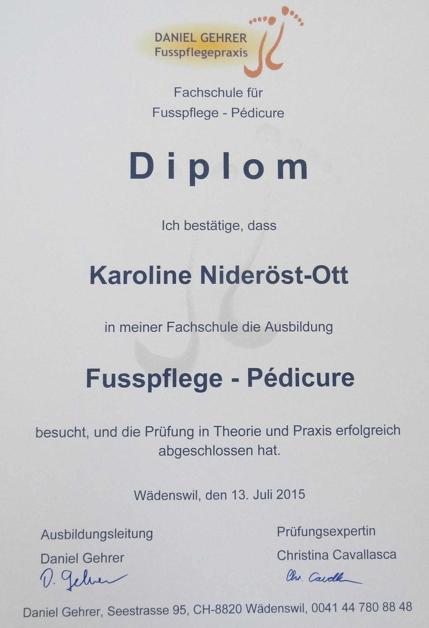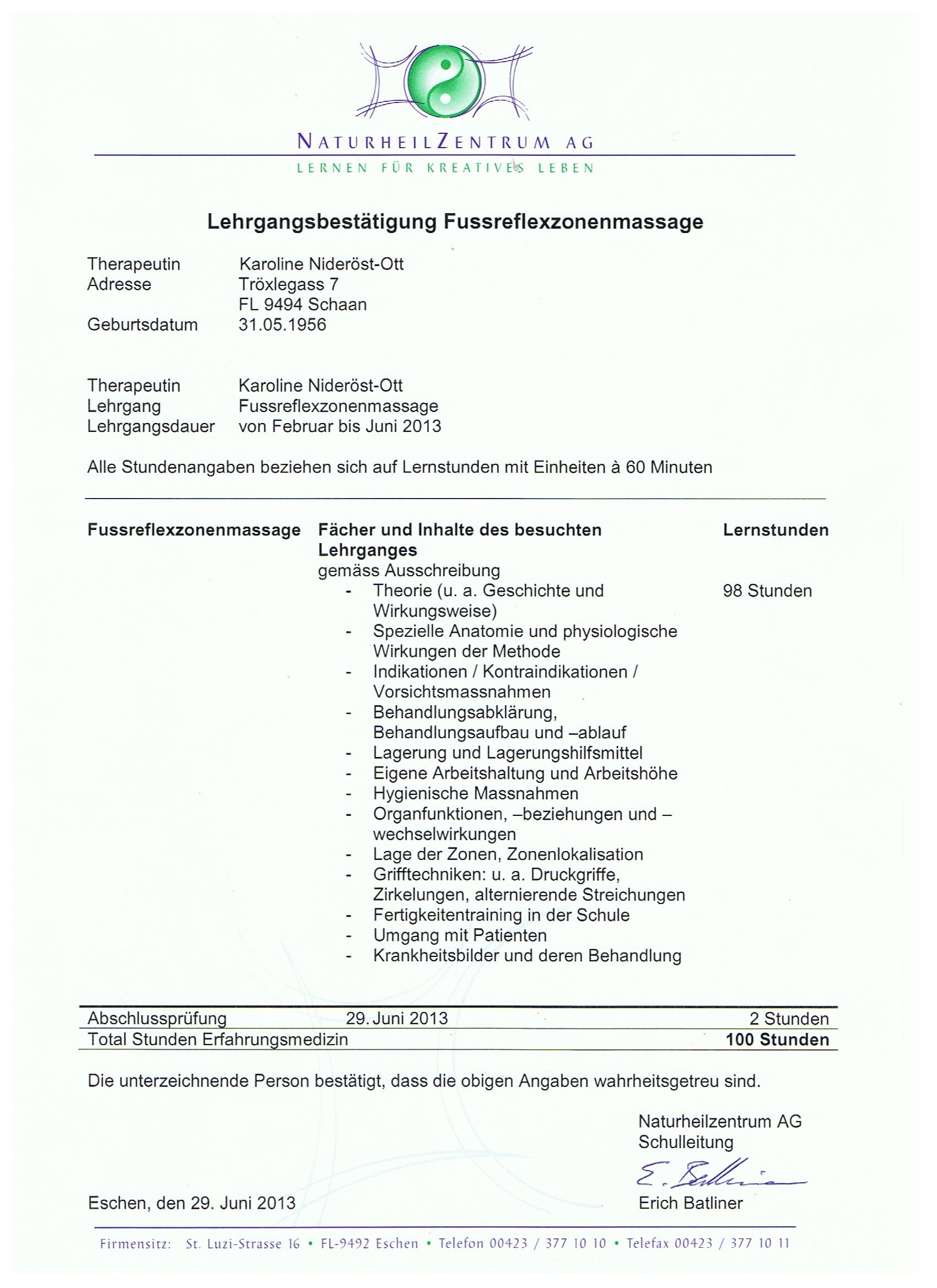 Dipl. Gesundheitsmasseurin / Dipl. Fusspflegerin SFPV / Dipl. ganzheitliche Körperpflegerin nach Dr. h. c. Peter Jentschura