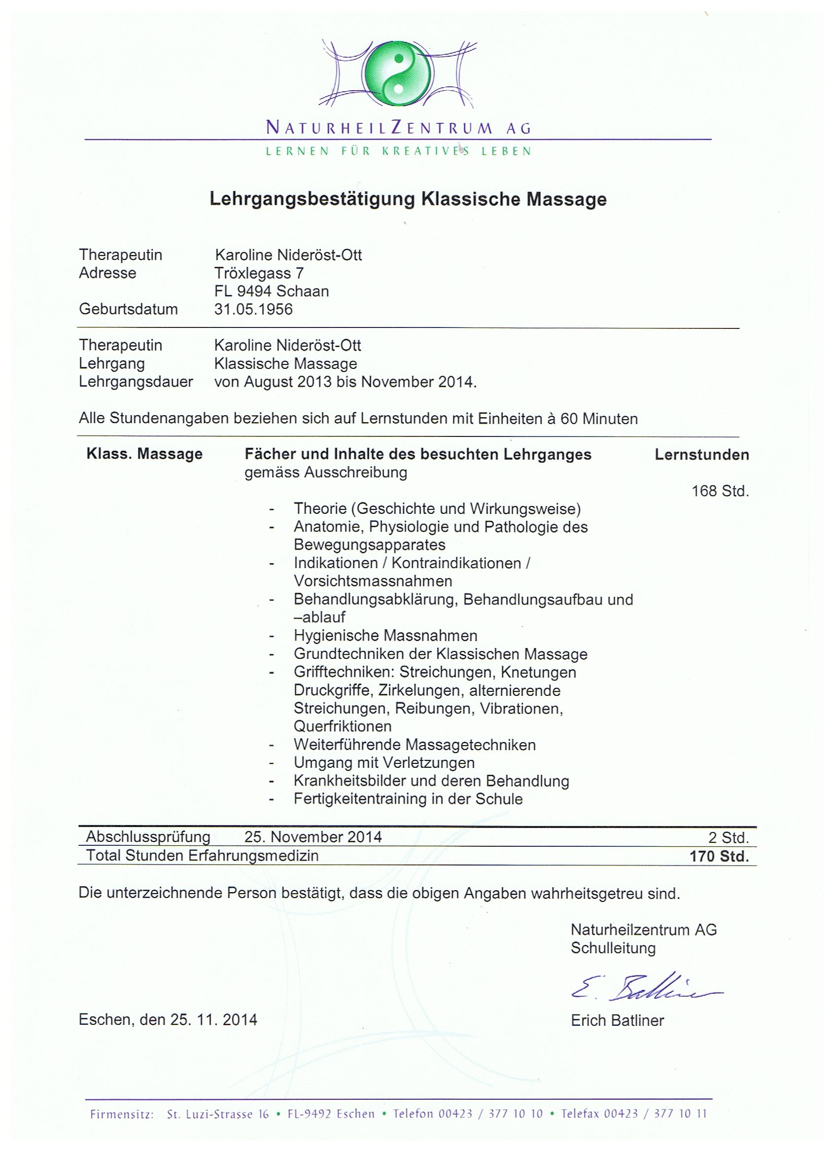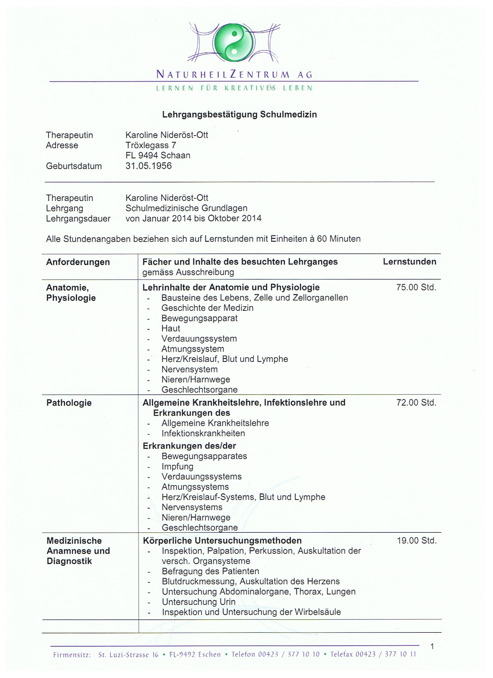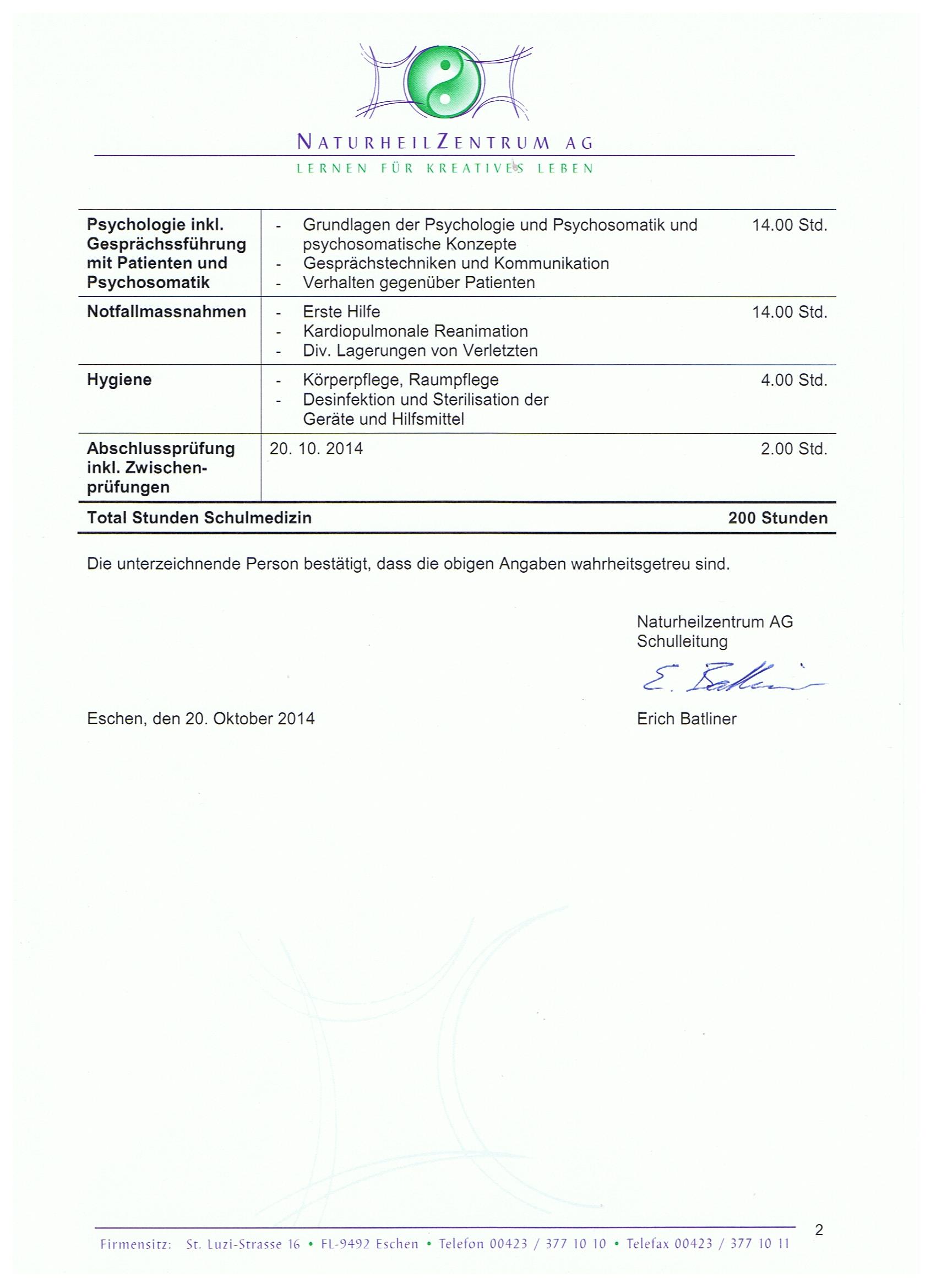 Naturheil Zentrum AG, 9492 Eschen (inkl. schulmedizinische Grundlagen, 200 Stunden)